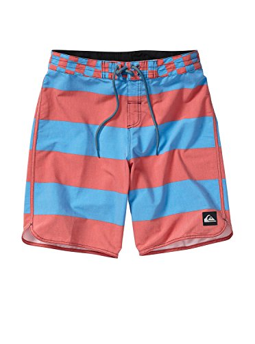 Quiksilver Young Mens Brigg Scallop water repellent boardshort with triple tie closure and a round cotton drawcord, the New Short Fly, flat back pockets, and scallop hems and side bindings.