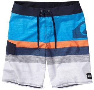 Quiksilver young men's "slater" traceable recycled 4 way stretch boardshort with the new short fly and basic drawcord, welt side pocket with pocket flap, and stretch stitch bottom hems. A Kelly slater signature style