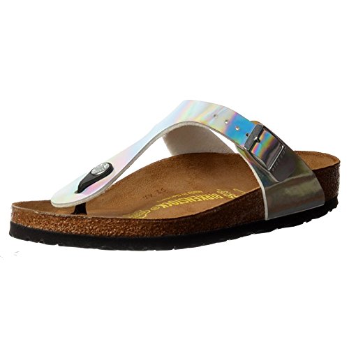 FEATURES of the Birkenstock Women's Gizeh Sandal Cork and latex footbed designed to mirror the shape of a healthy foot and provide a natural walking environment More toe room allowing toes to move naturally, which promotes better balance and correct foot alignment from toe to heel Raised toe bar encourages natural gripping motion of your feet, exercises the legs and stimulates circulation Contoured footbed ensures even weight distribution and proper posture Deep heel cup cradles the heel and keeps natural cushioning right under the calcaneous (also known as the heel bone) Shock absorbing sole is flexible, durable, lightweight, repairable and replaceable, like almost every part of our shoes Jute fibers made of two layers - one wicks away moisture, the other adds strength Cork footbed is firm and resilient for maximum support Footbed Liner made of soft suede keeps your feet comfortable and dry